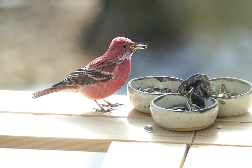 初飛来のオオマシコさん、そのまましばらくウッドデッキのひまわりの種を食べていました。種を割った瞬間の、細かい破片が飛び散る様子が写真に写っていました。