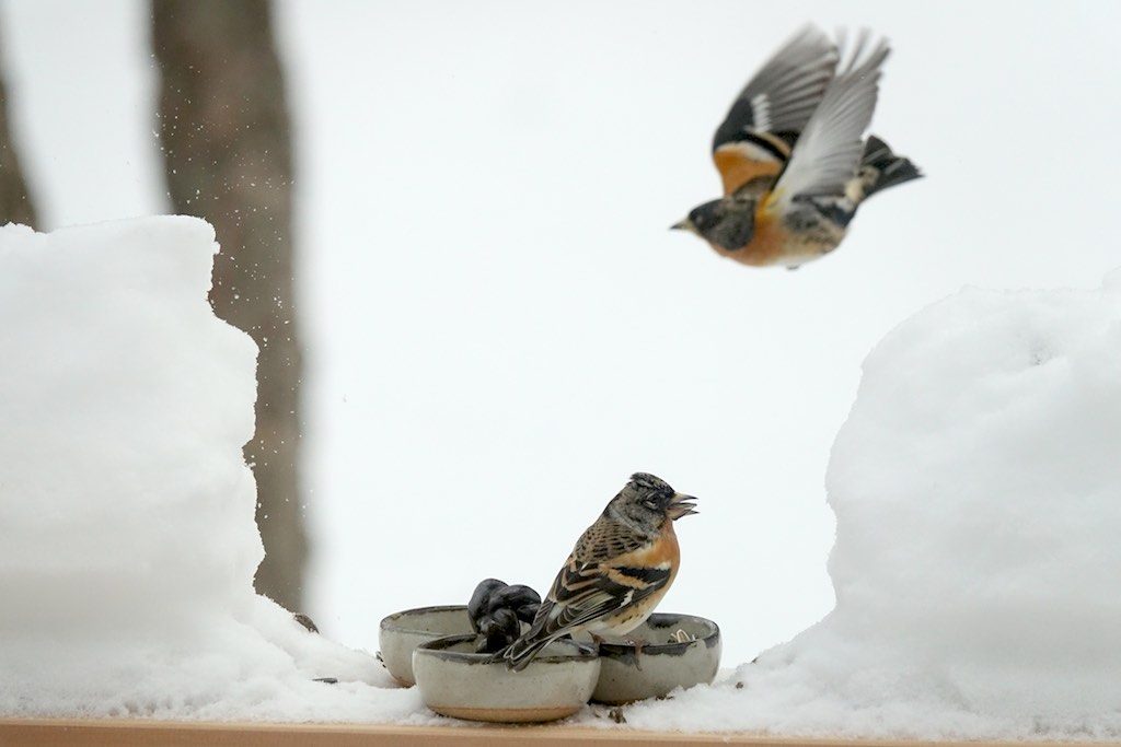 雪がたくさん降って餌を見つけにくくなってくると、野鳥がたくさんやってきます。今日はアトリ一族が集団で手すりの餌をねらってやってきました。餌場を独占してしまうので、適宜追い払っています(笑)