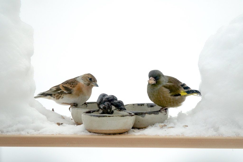 この二人は割と気が合うみたいです。集団でやって来るところとか、餌台を占拠する癖とか、人間が来たらすぐ逃げるところとか、そんなところも似ています。