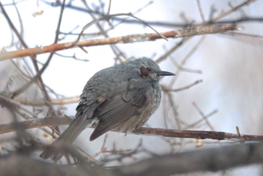 大きな塊が木にくっついていると思ってよく見たら、丸くなったヒヨドリでした。それにしても丸すぎる・・・