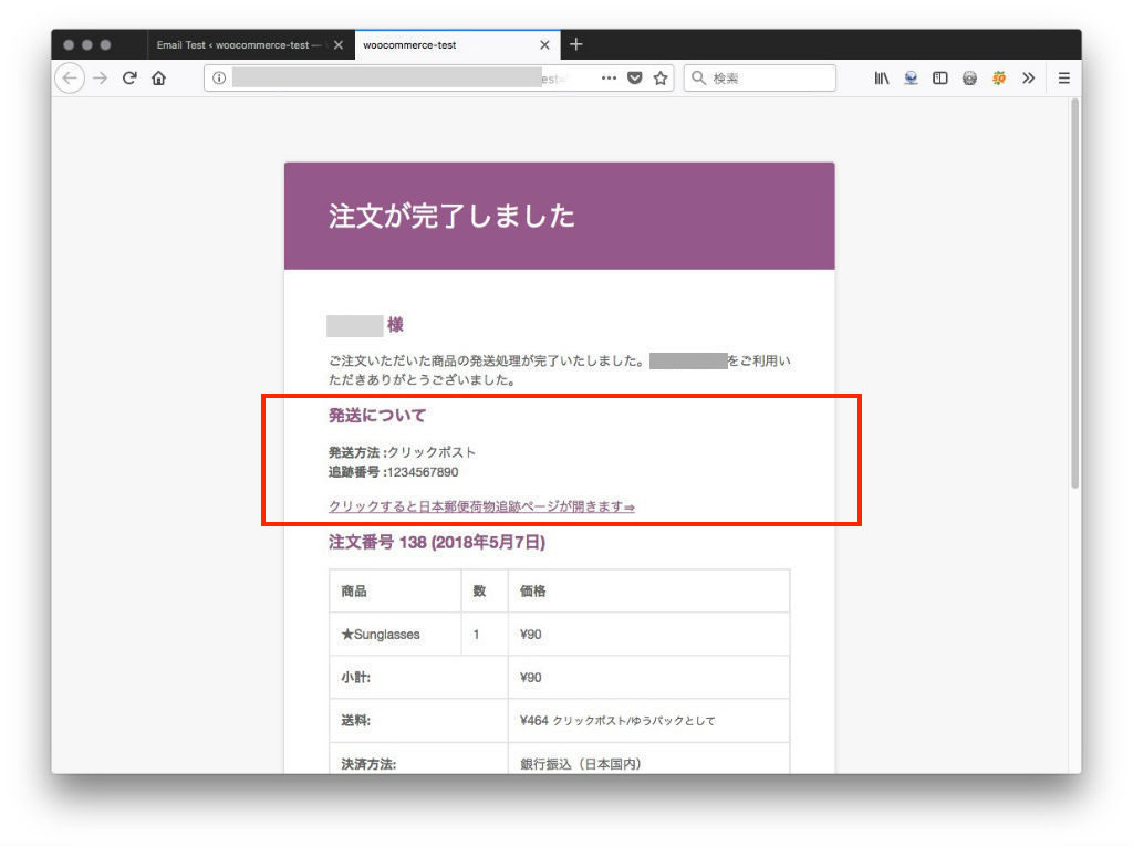 - Email Testプラグインにより、「完了済みの注文メール」に追跡番号がちゃんと記載されているか確認する。