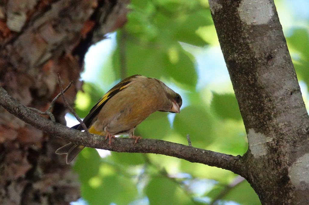 私が餌場に近づくと逃げて木の上から様子をうかがうカワラヒワ。カワラヒワは体がとても柔らかいみたいです(笑)