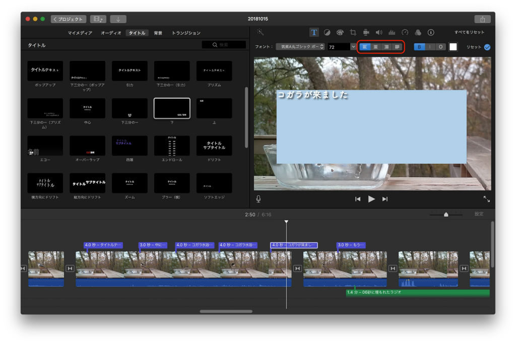 iMovieのタイトルは、元々提供されたものしか使用することができず、しかもレイアウトも決められているため自由度が少ないです。しかし、そんななかでも、テンプレート「下」は、文字入力画面で改行すると、文字の位置が上に移動していくので、まだ自由があります。そこで、こちらを使用することにします。