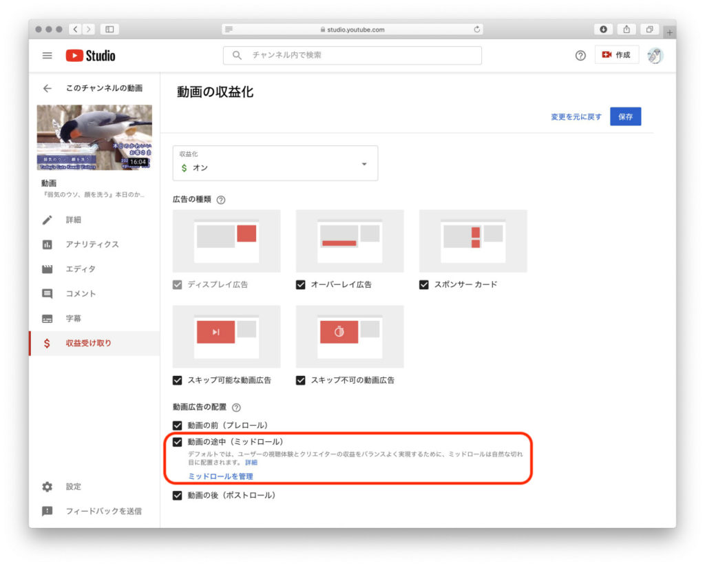 ミッドロール広告は視聴者にとても不評で、以前知らずオンになっていた動画のコメント欄でぼろくそに言われたことがあります。自分もこんなウザいものはないと思うので、設定を外したいのですが、一つ一つ動画の収益化設定を変更するのはとても大変です。