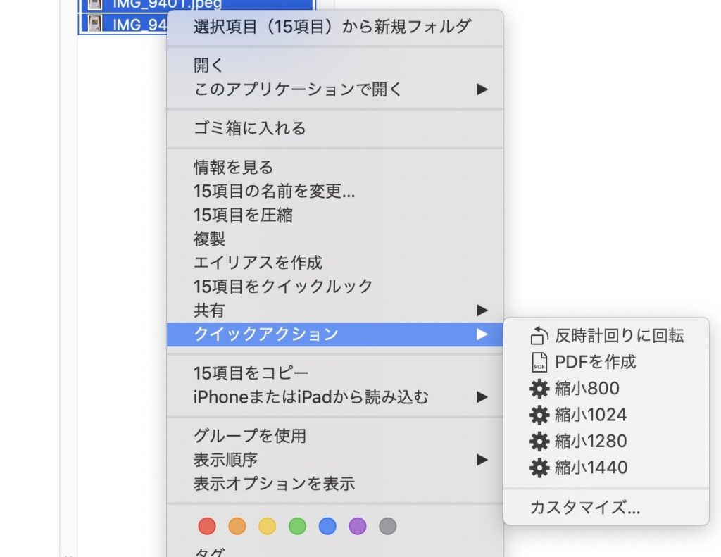 上記を保存すると、以下のように画像ファイルで右クリックした際に表示される「クイックアクション」項目に、先ほど作成したクイックアクションがリストされるようになります。