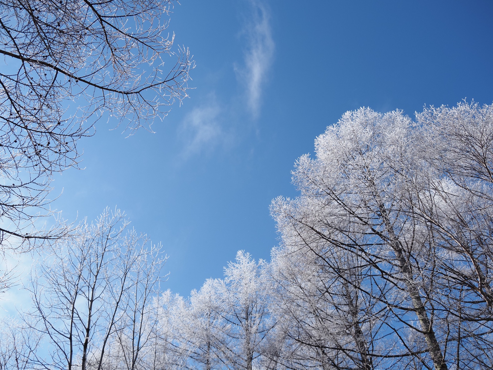 雪が全然降らないです・・気温が下がったこの日の朝、木の高いところに霧氷ができて、久しぶりに冬らしい景色となりました!