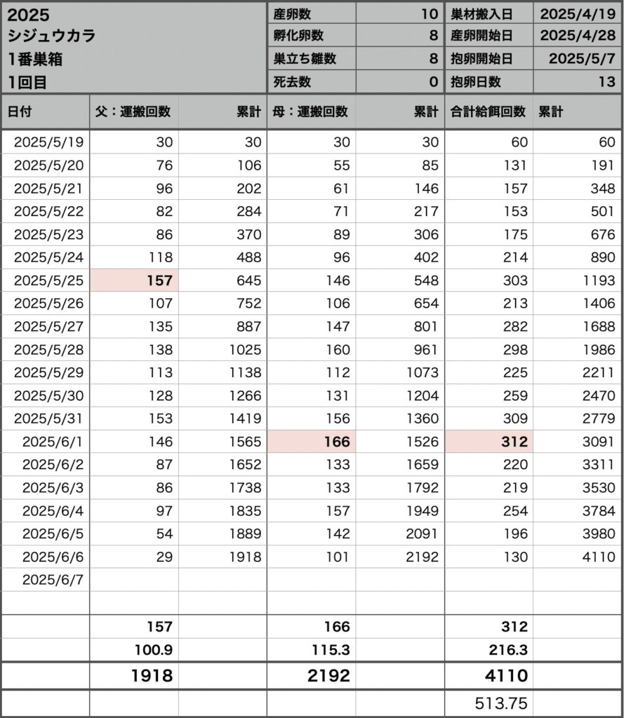 1羽あたり513回 シジュウカラの最高記録とはなりませんでした