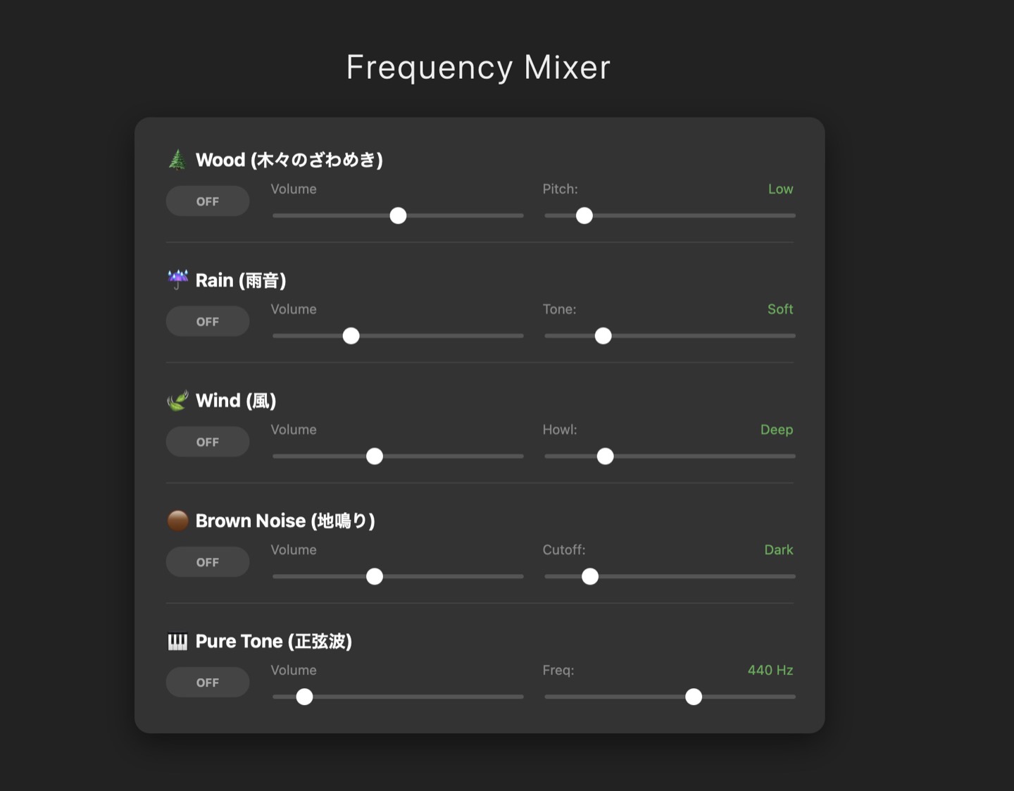 その後何度かやり取りして、正弦波(Beepモード)とノイズ生成+フィルター加工(Woodモード)という2種類の音それぞれについて、周波数や長さを調整できるようにしてもらい完成しました。